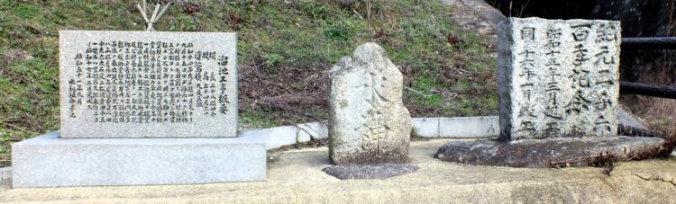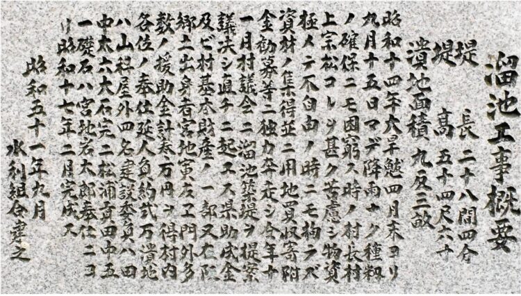 碑文=写真㊦=によると、昭和14年の大旱魃の時、「物資極メテ不自由ノ時ニモ拘ラズ」村長村上宗松氏の下で決議され、昭和17年に完成した。