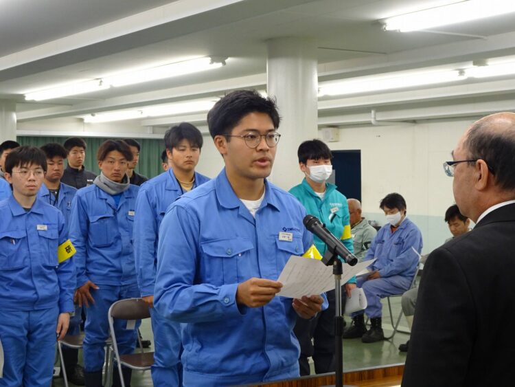 入校式では因島技術センター運営協議会高田光紀会長の挨拶に続き研修生を代表してイワキテックの山本一成さんが決意表明をした。