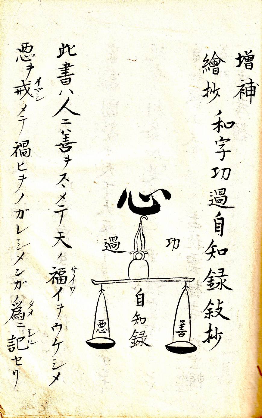 この中で特に注目されるのは「善」と「悪」を天秤に掛けた絵で始まる「和字功過自知録叙抄」である=写真②。