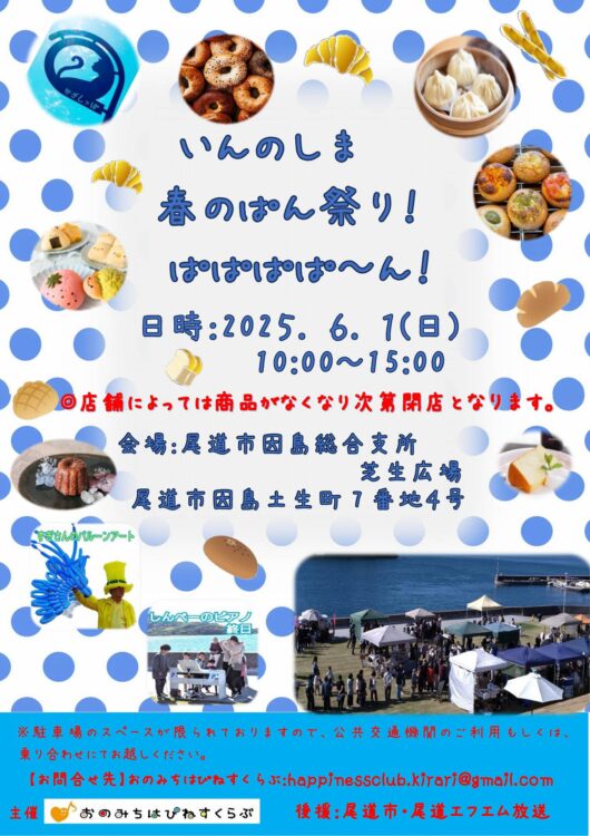 「いんのしま春のぱんまつり!ぱぱぱぱ~ん!」が6月1日(日)、尾道市因島土生町の因島総合支所芝生広場で開催される。時間は10時から15時まで。2023年春の初開催から数えて今回で5回目の開催となる。