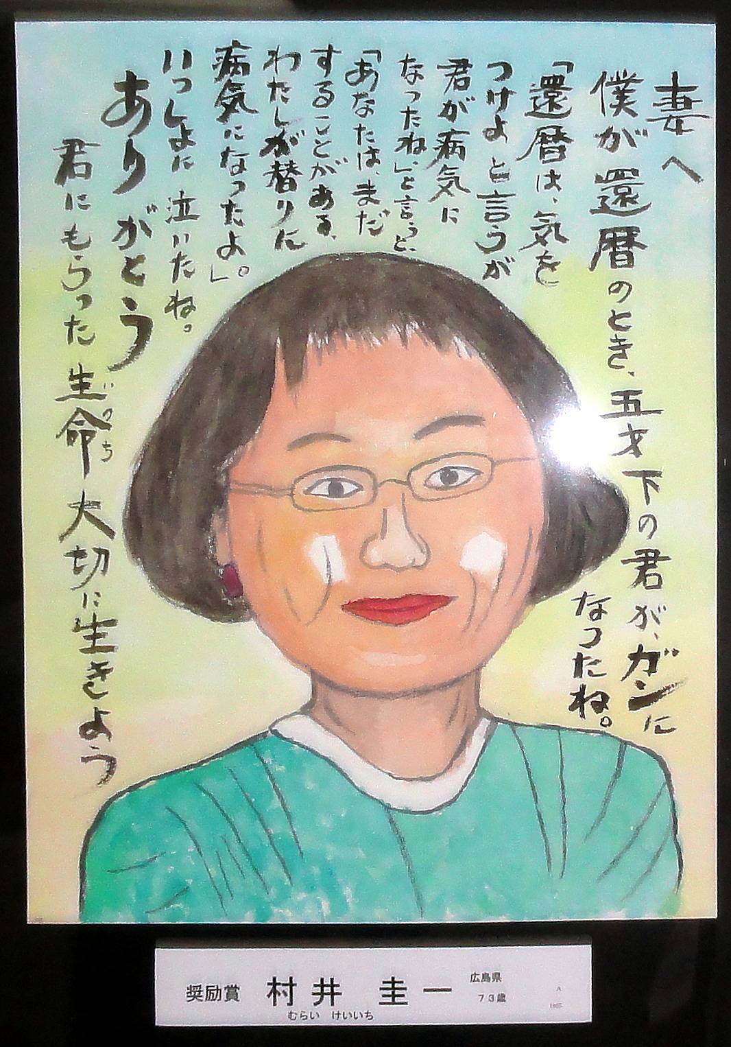 2013年(平成25年)7月1日に58歳の若さで亡くなった妻・和子さんへの感謝の思いが込められており、来場者の心を打っている。村井さんは「今年の年賀状にはこの受賞作をプリントし、元気で頑張っていることを友人や知人に伝えました」と笑顔で語った。