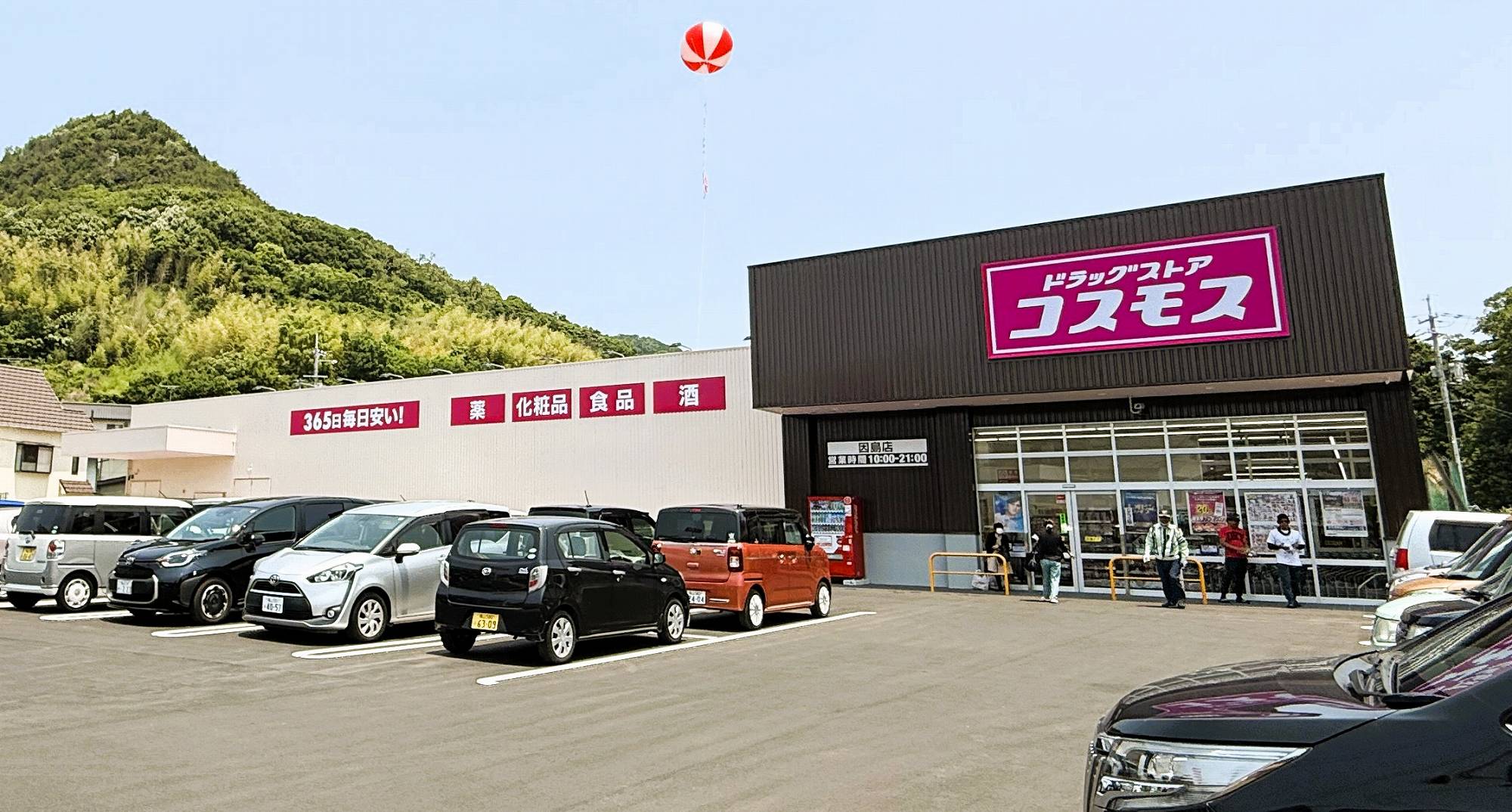 ドラッグストア「コスモス因島店」(運営=コスモス薬品)が5月31日、尾道市因島田熊町竹長区(日立因島生協本部跡地)にオープンした。約1366㎡の店舗に57台分の駐車場を備え、多くの買い物客でにぎわった。