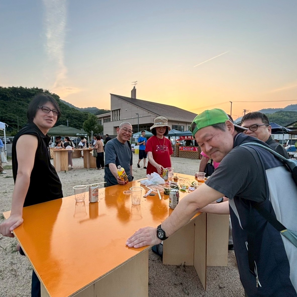 夕方になると日中の陽射しが和らぎ、夜市の灯りが点る頃には人々が集まり、地元野菜やお惣菜、スイーツ、鮮魚など多数の品揃えの買い物を楽しみました。昼間の開催とは違った客層で約700人が集い、冷たいビールを設置された立ち飲みスタンドで呑んだり、顔馴染みが賑わい、ゆったりとした時間を過ごす憩いの場になりました。