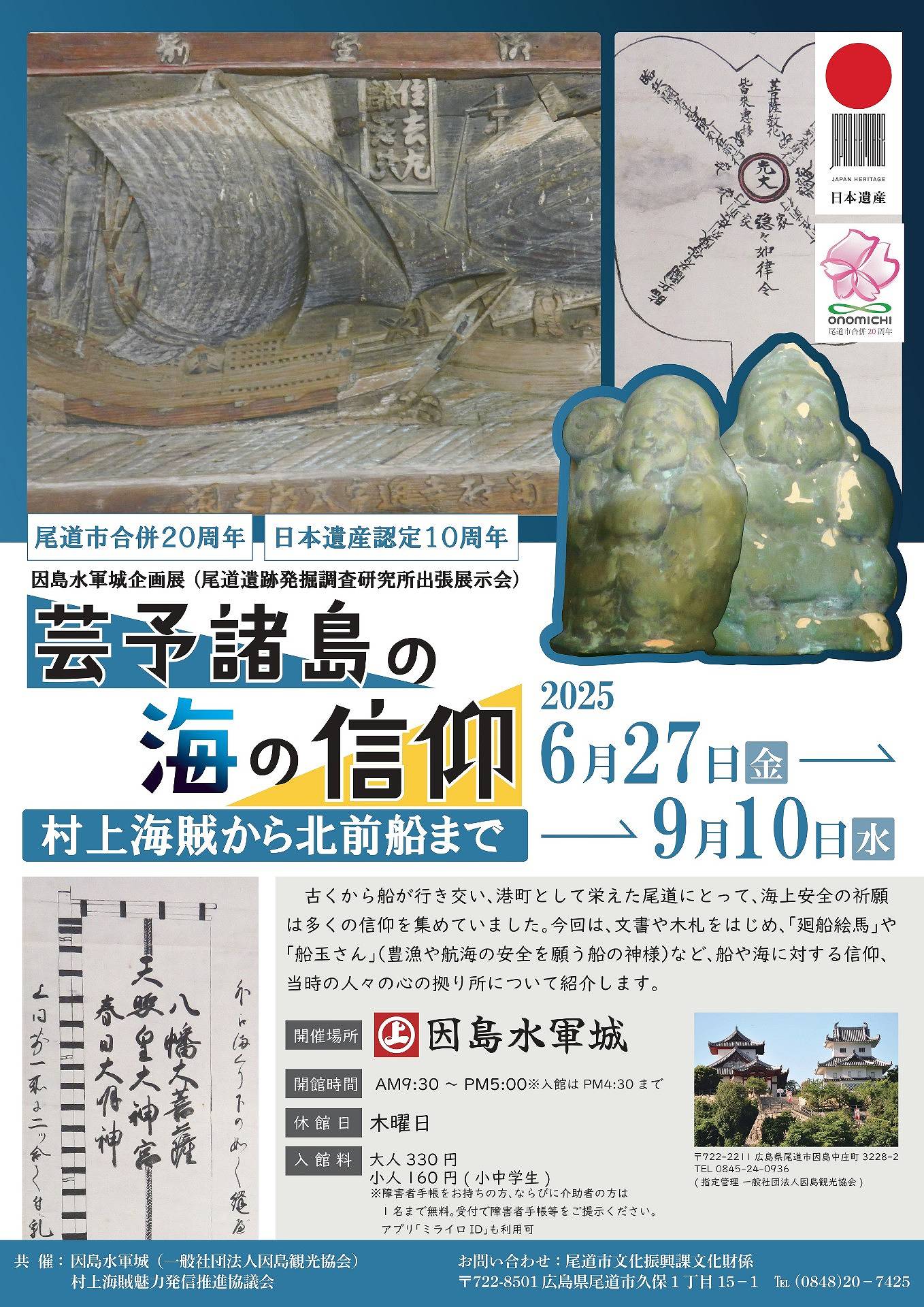因島水軍城で7月27日、日本遺産認定10周年・尾道市合併20周年を記念して「芸予諸島の海の信仰~村上水軍から北前船」企画展が始まる。9月10日(水)まで。