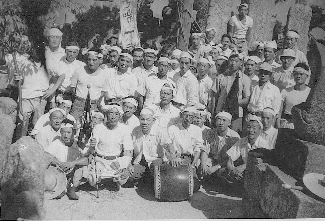 写真㊤は昭和34年9月23日に平和一神和石を設置した時のもので太鼓が写っている。太鼓を叩きながら「豊年だー、万作だー、よーかったね」と囃しながら登った。まさに瀬戸内の農村にピッタリの光景であった。