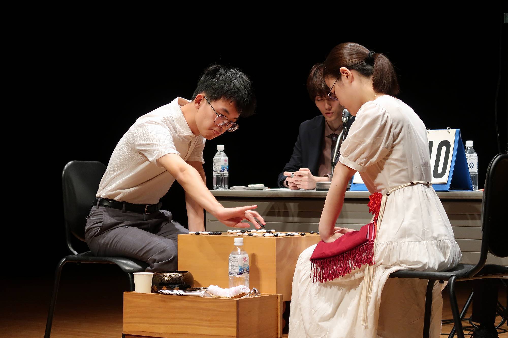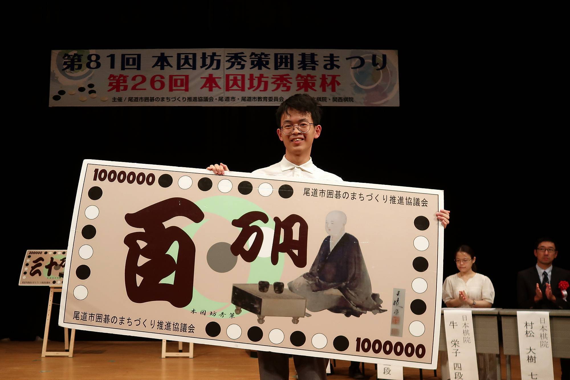 秀策杯決勝戦では、関西棋院の表悠斗(おもて・ゆうと)三段(高校3年生18歳)が、日本棋院の牛栄子(にゅう・えいこ)四段との熱戦を制し=写真㊤=、「中押し勝ち」で優勝。表三段には賞金100万円が贈られた=写真㊦。準優勝の牛四段には30万円が、2勝を挙げた棋士には10万円、1勝には3万円の賞金が贈られた。