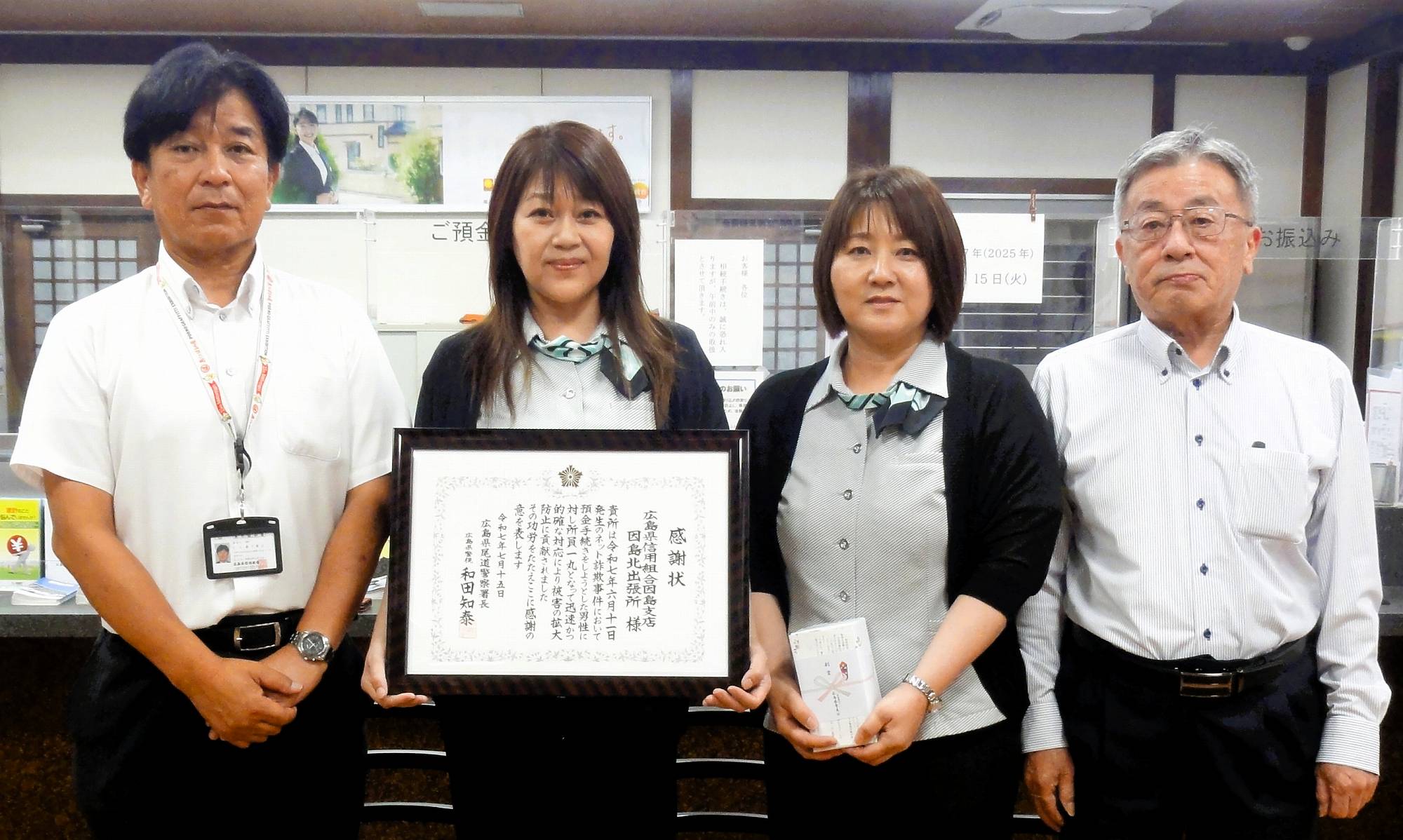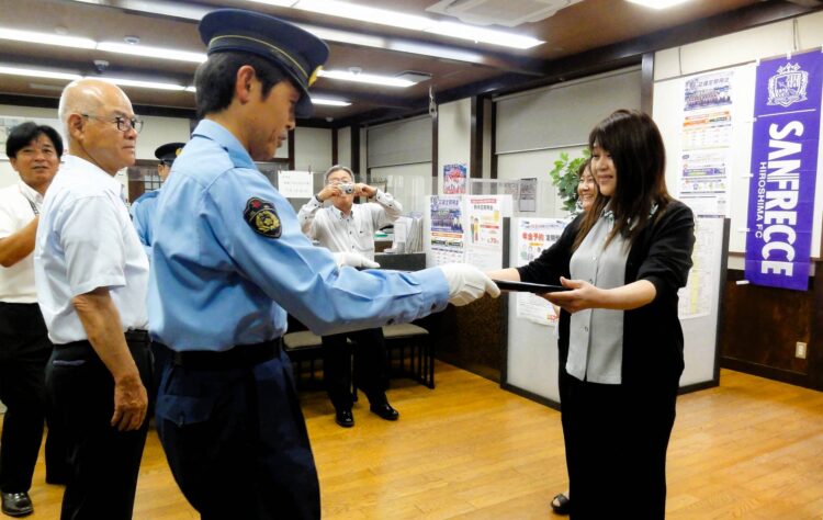 架空料金請求詐欺の被害を未然に防いだとして、尾道警察署は7月15日、広島県信用組合(ケンシン)因島支店北出張所とファミリーマート因島土生店に感謝状を贈った。感謝状は水野耕一因島分庁舎長から手渡された=写真㊤。