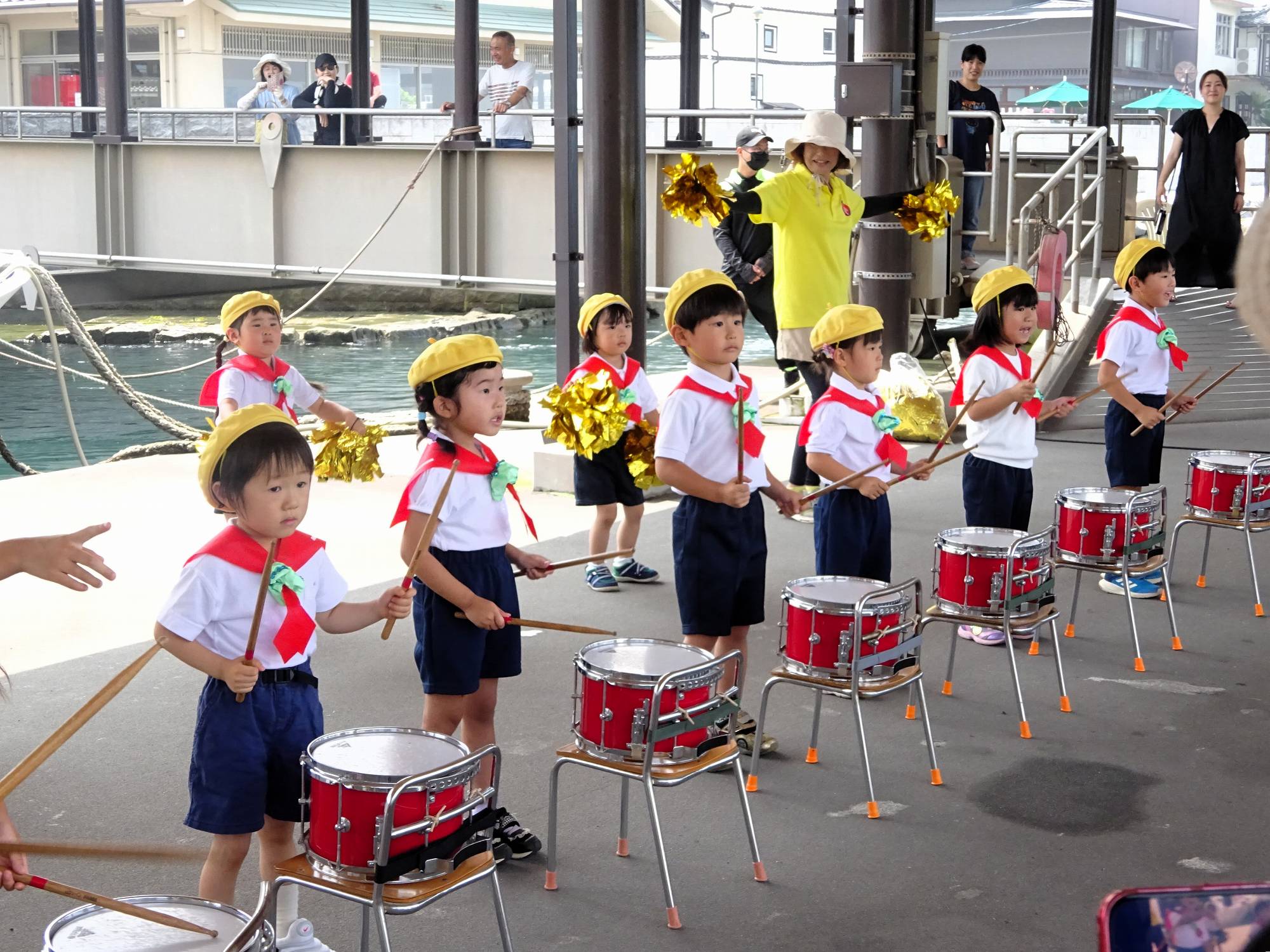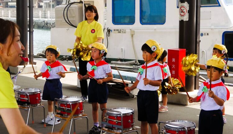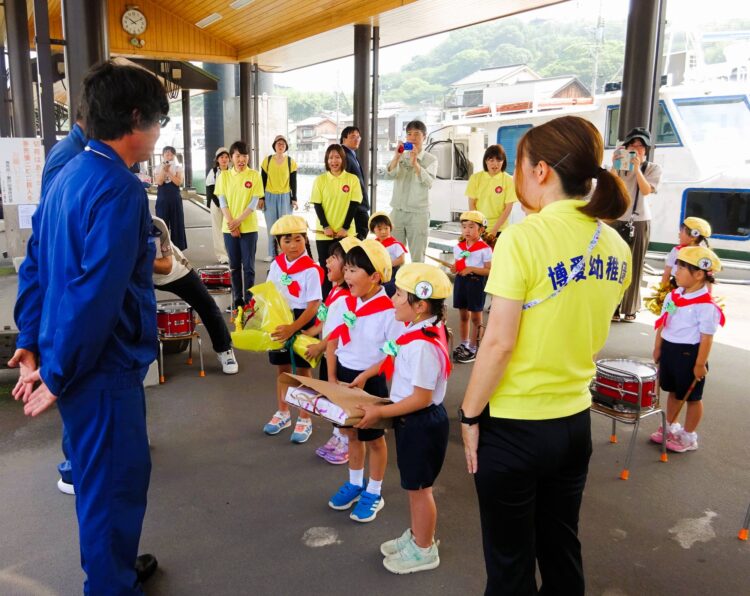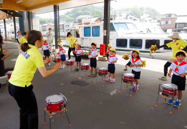 因島・瀬戸田地区では7月9日、瀬戸田港桟橋で瀬戸田博愛幼稚園園児たちが、入港した弓場汽船運航高速船かがやき5号を訪問。10時15分発の前に年長・年中園児たち11人はおそろいの衣装を身にまとい小太鼓のリズム打ちで「ゆめいっぱい」を演奏し、船長に花束と記念品を贈呈した。