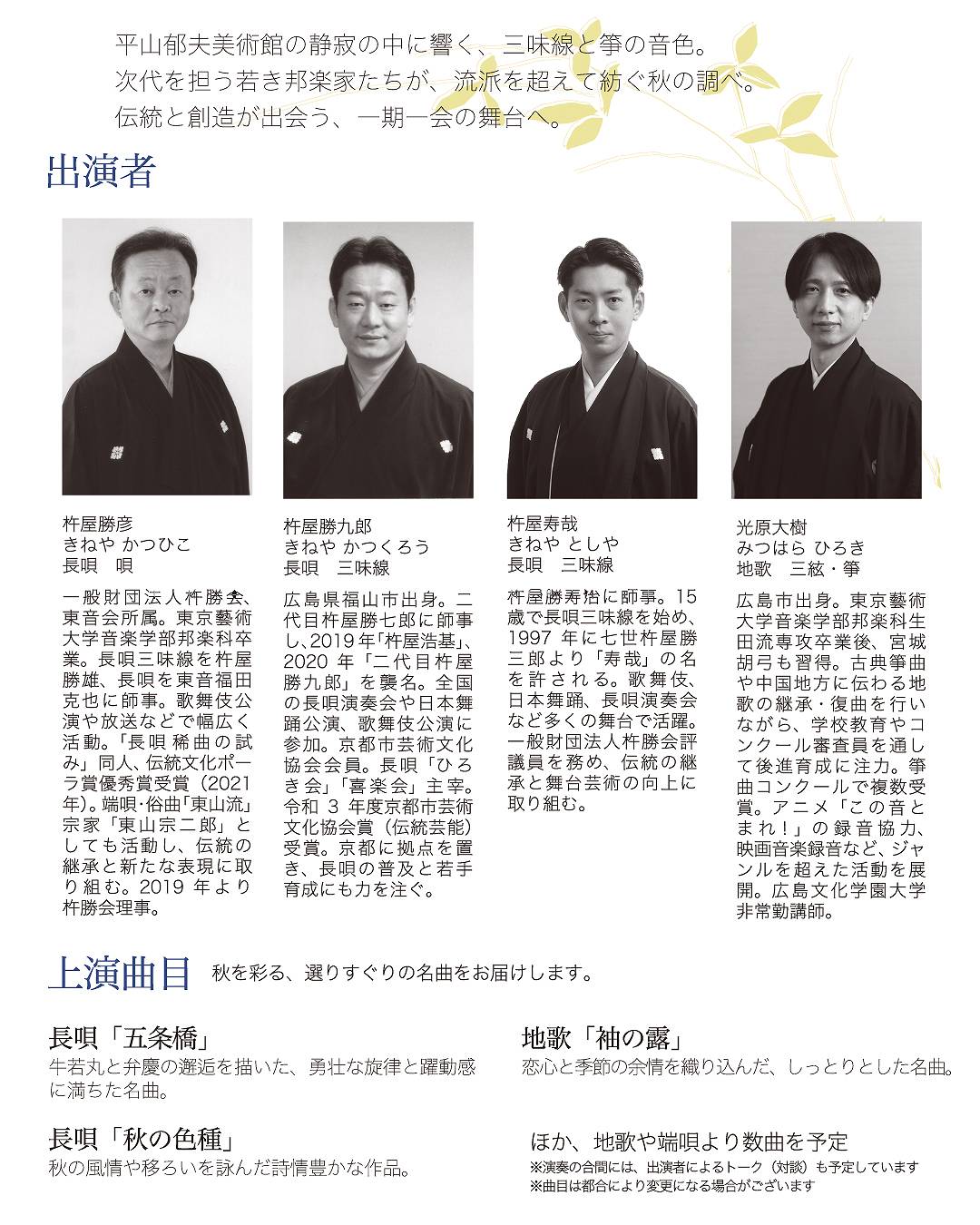 杵屋勝彦(長唄・唄)▽杵屋勝九郎(長唄・三味線、福山市出身)▽杵屋寿哉(長唄・三味線)▽光原大樹(地歌・三絃・箏、広島市出身)。長唄「五条橋」「秋の色種」地歌「袖の露」ほか。