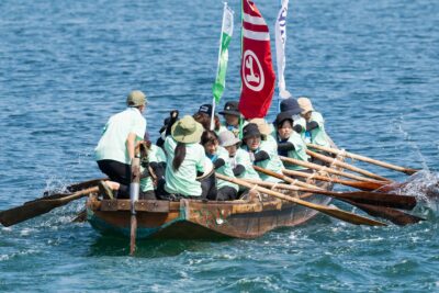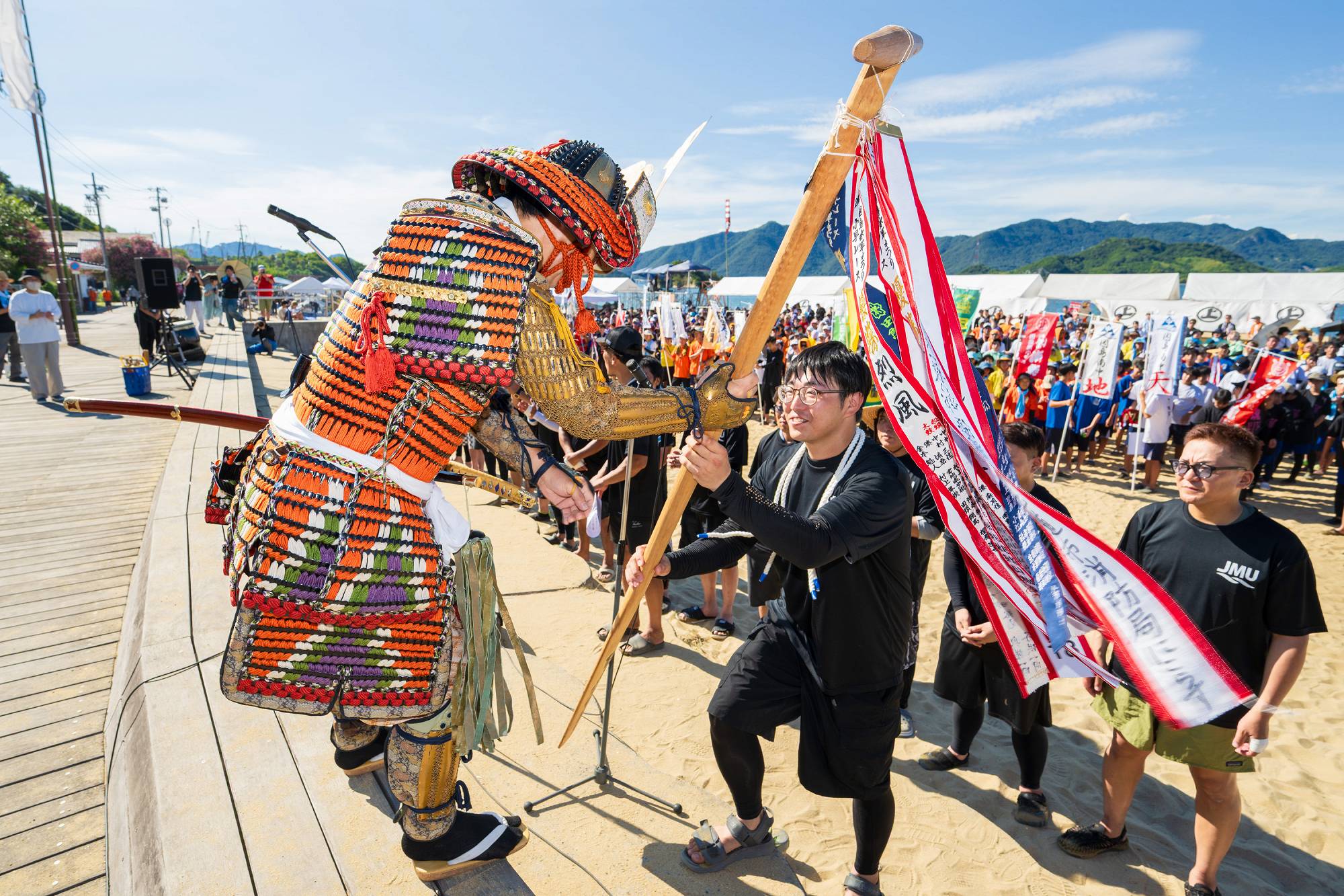 第32回因島水軍まつり「海まつり」が8月31日、尾道市因島大浜町のしまなみビーチとアメニティ公園一帯を舞台に展開された。村上水軍の伝令船「小早レース」には、一般・レディース・小学生・中学生の46チームが出場し、最速を競って激しいレースが繰り広げられた。