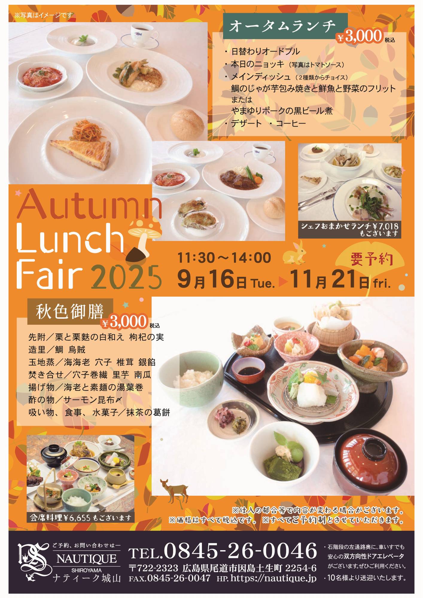 洋風のオータムランチ、秋色御前いずれも3千円(税込)。会席料理(6,655円)もある。
