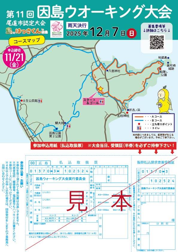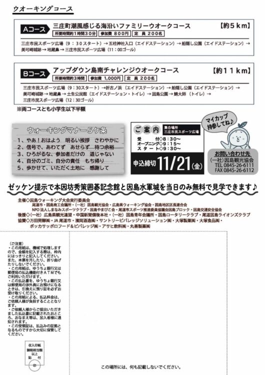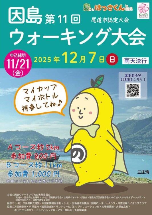 主催は実行委員会。尾道市▽因島商工会議所▽因島観光協会▽広島県ウォーキング協会▽因島地区区長連合会▽しまなみスポーツクラブ▽因島やまびこ会▽スポーツ推進委員協議会因島ブロック▽因島交通安全協会などが参加団体。因島青年会議所、因島ロータリークラブ、尾道因島ライオンズクラブなどが後援。