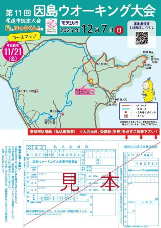 第11回因島ウォーキング大会が12月7日(日)、三庄市民スポーツ広場(旧三庄中学校グラウンド)を発着点にして島内の南部地域を舞台に繰り広げられる。
