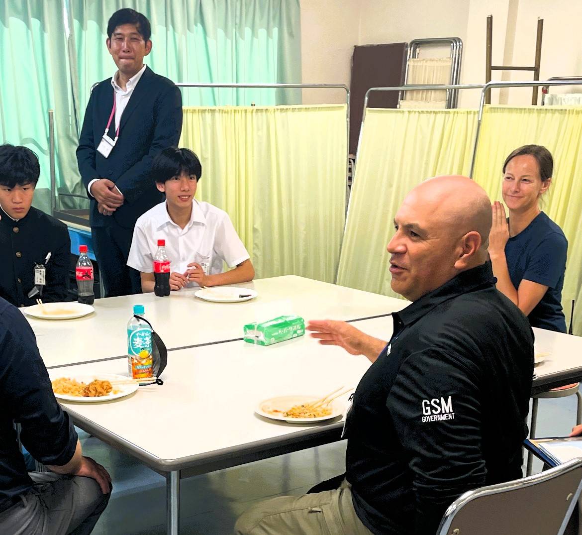 重井中生、英語で造船所交流 JMU因島事業所でアメリカ人エンジニアとランチ