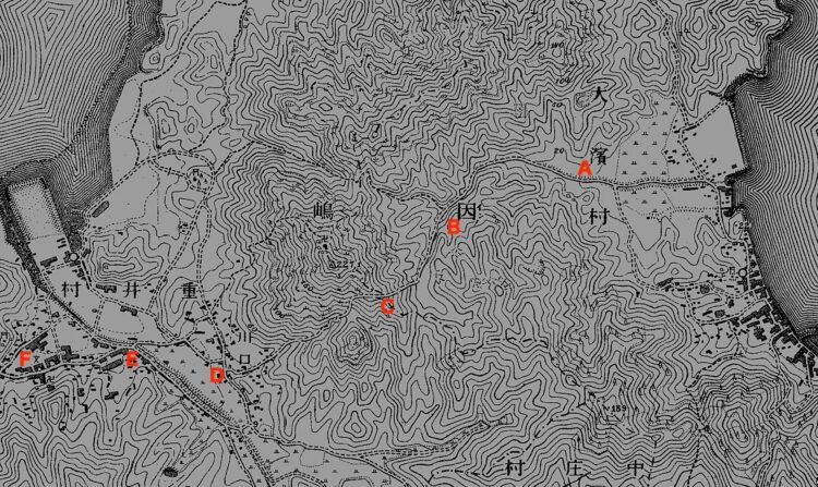 図は明治30年測量の地図。A~Fが通学路。Cが村境で白滝山登山道と接する。