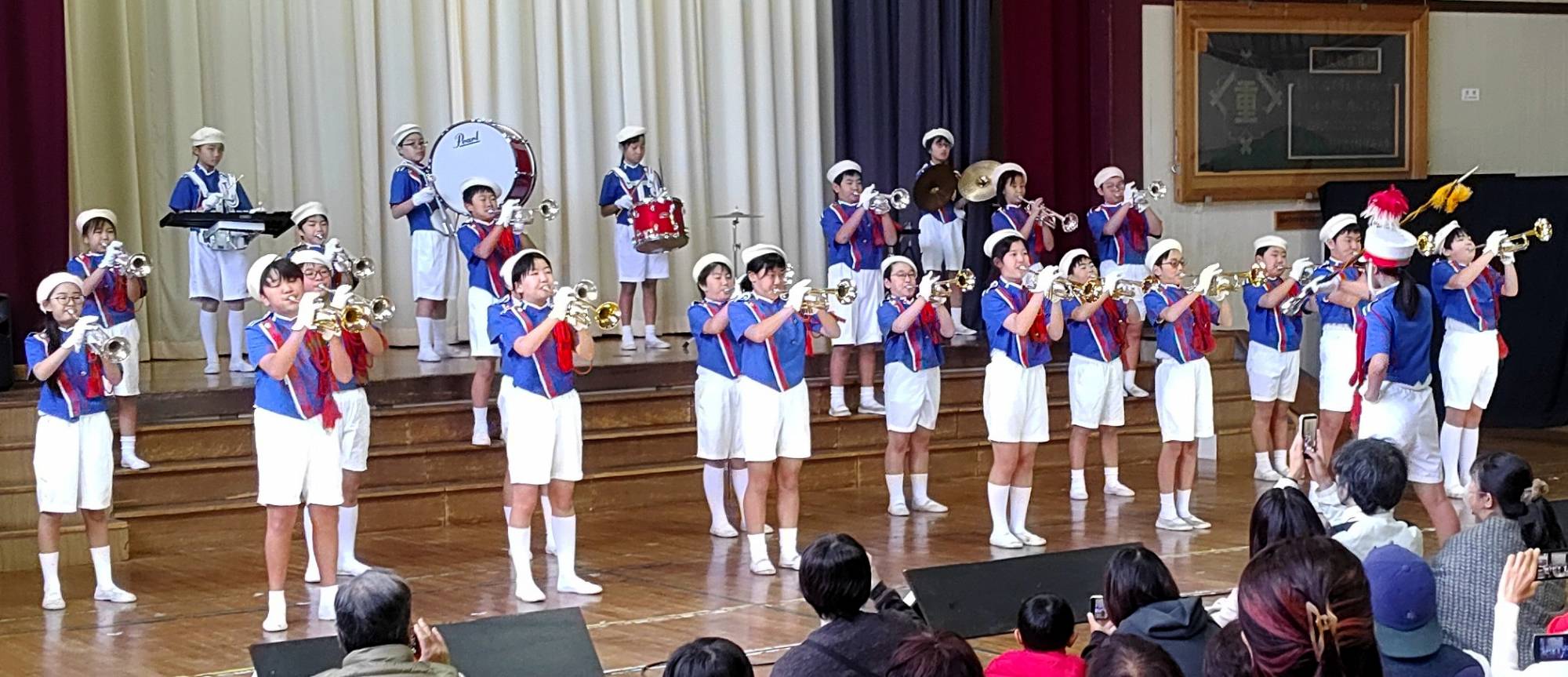 重井小学校の伝統である第60代トランペット鼓隊が登場。「キラキラ星」「校歌」「ミッキーマウスマーチ」に加え、因島商工会議所と連携して新たに譜面を起こした「はっさくんのテーマ」を披露した。演奏後には第61代への引き継ぎ式も行われた。