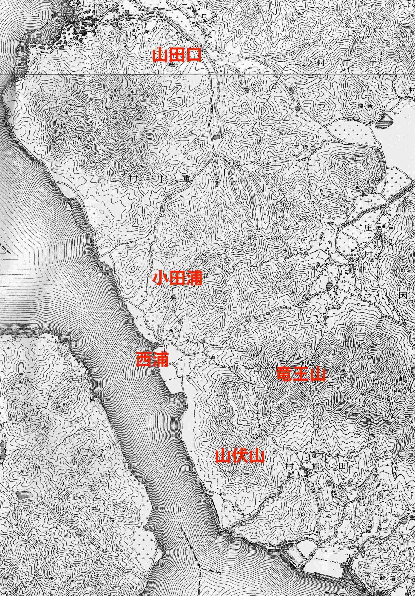 さて、その通学路であるが、明治30年の測量地図=写真㊦=で考えると田熊村をどう越えるかが問題となる。海岸沿いは全て全通しているとは考えられない。すると山伏山と竜王山の間を通って西浦に出、小田浦から現在の運動公園横を通って一本松よりやや西の山田口へ出るルートが考えられる。しかし土生重井間を毎日1往復するのは、体力気力共並みのことではできないと思う。