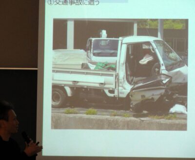 続いて河野さんが講演。2018年、笠岡市で軽トラック運転中に乗用車と正面衝突し、命はとりとめたものの「脚を切断するか否か」「歩けるか否か」という重傷を負った。当時を振り返り、「家族や病院の支え、そして『必ず生きる』『歩けるようになる』という楽観性が自分を支えた」と語る。