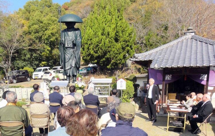 参列者からは「銅像がまだ下(元の場所)にあった頃、遊び場だった」と懐かしむ声も聞かれ、地域に根付いた弘法大師信仰の深さと、時代を超えて親しまれる像の存在感があらためて示された。