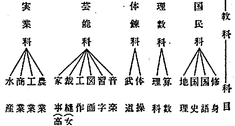 国民学校の最も大きな特徴である国民科について見てみよう。国民科というのは「教科」の名前であり、他に、理数科、体練科、芸能科、実業科(高等科のみ)があった。その教科・国民科は修身、国語、国史、地理の科目から構成された。