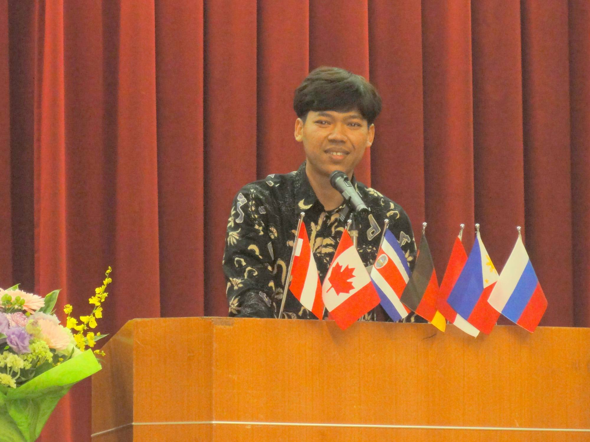 因島鉄工(株)からは、インドネシアより2年前に来日したサトリオ・ウィボウォさんが出場。「新しい居住地で新しい趣味を見つける」について流暢なスピーチと、大好きな歌「島人ぬ宝」を参加者の手拍子に合わせて披露した。スピーチ全文は後日掲載。