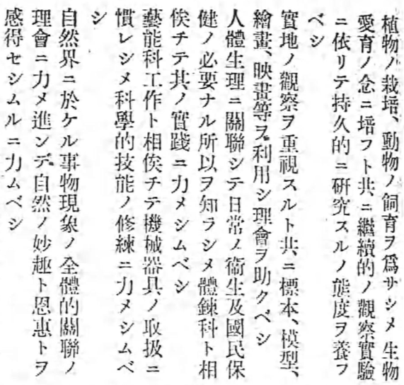 「理数科は通常の事物現象を正確に考察し処理するの能を得しめ之を生活上の実践に導き合理創造の精神を涵養し国運の発展に貢献するの素地に培うを以て要旨とす。
