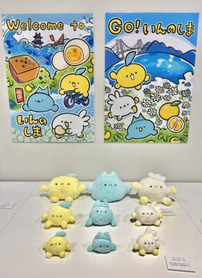 卒業研究のテーマに選んだのは「因島をいかにアピールするか」。はっさく、除虫菊、因島大橋、海の4要素を凝縮したキャラクターを考案した。単なるデザインに留まらず、キャラクターを取り入れたぬいぐるみやパペット、手ぬぐいなどのグッズ、紹介ポスターまで制作。因島の魅力を多角的に伝える工夫を凝らした=写真。