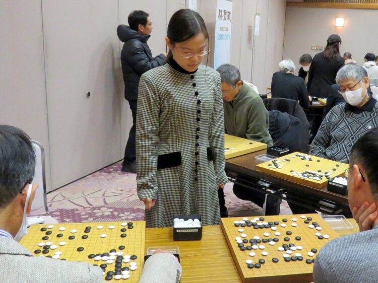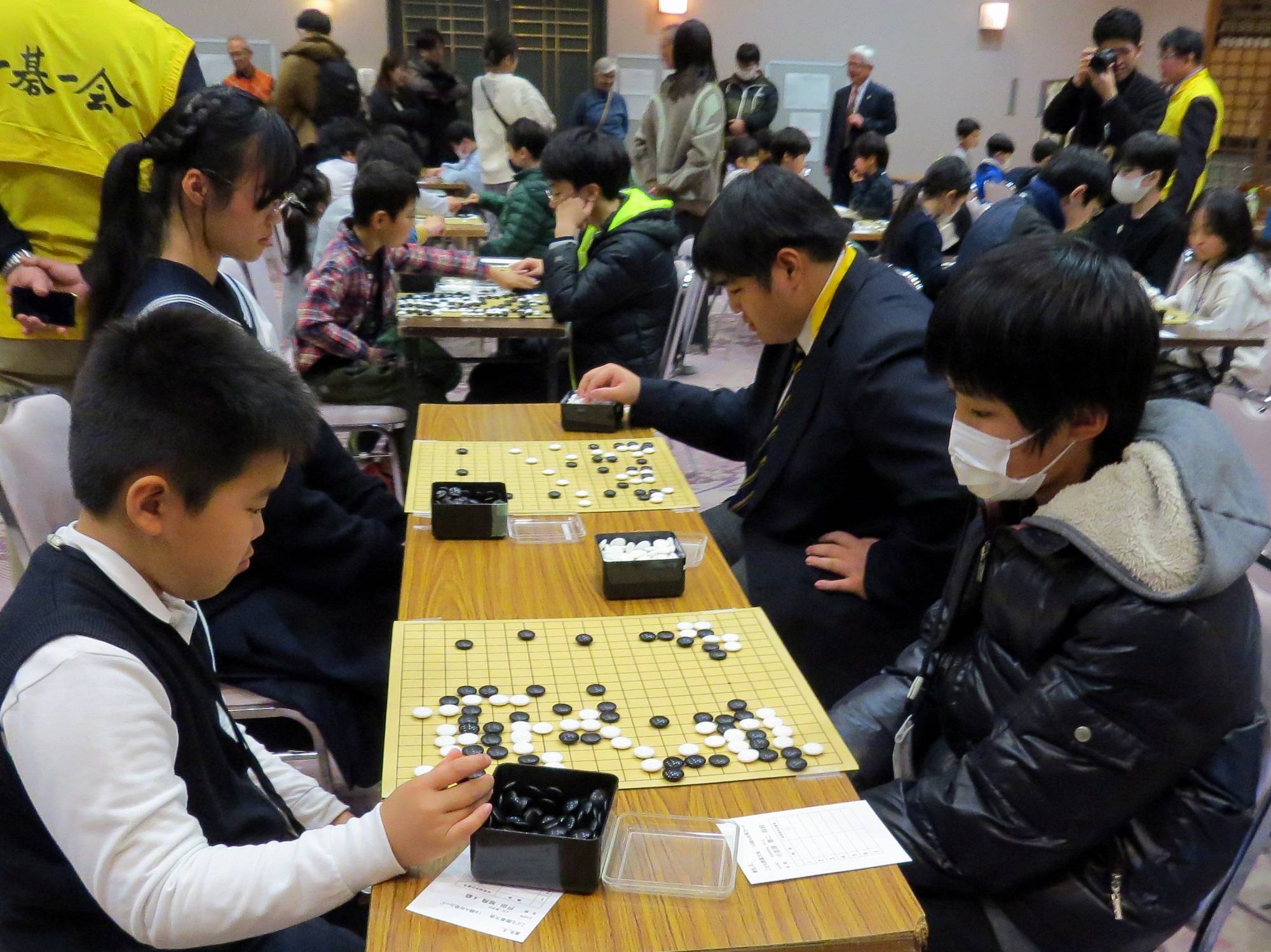 2月1日には、延べ39人が参加したプロ棋士6人による指導碁のほか、対局記念「子ども囲碁大会」も開催。小中高生39人が学年や段級位を越えて盤上で交流した。(19路27人、13路5人、9路7人計39人)