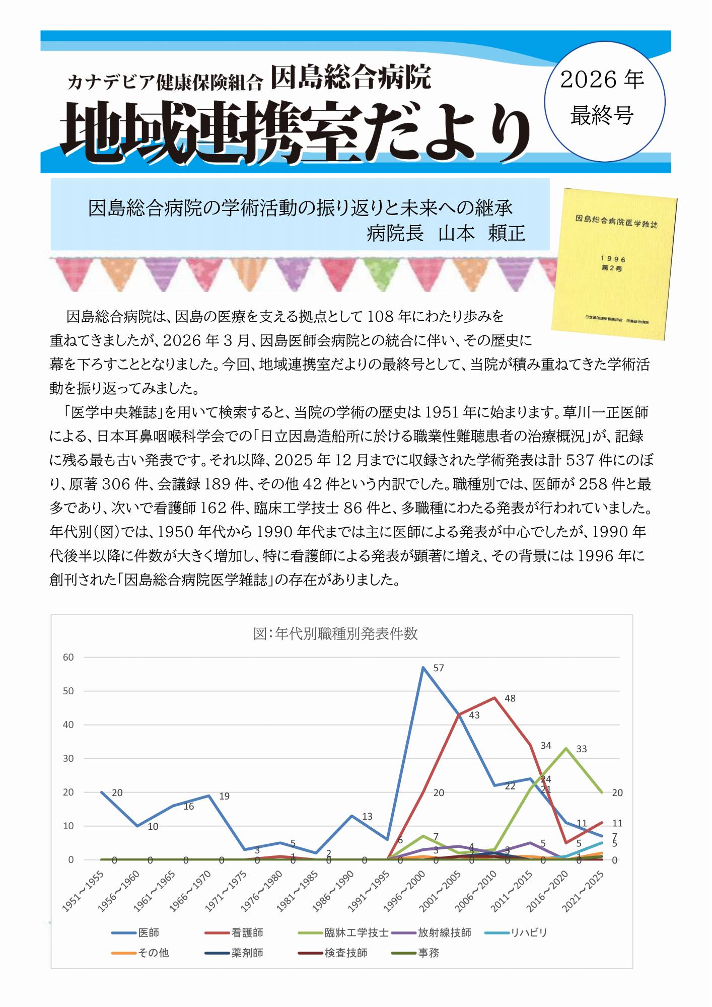 山本頼正因島総合病院長は閉院を前に「地域連携室だより」最終号を執筆。1951年以来537件に及ぶ多職種の学術活動を振り返るとともに、自院の医学雑誌を「地域の財産」として因島図書館へ寄贈し、その精神を新体制へ継承する決意を綴った。山本院長の寄稿全文を掲載する。