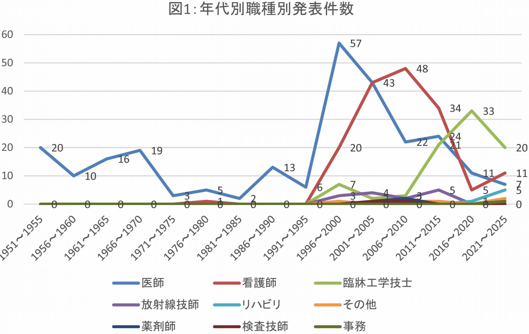 年代別(図1)では、1950年代から1990年代までは主に医師による発表が中心でしたが、1990年代後半以降に件数が大きく増加し、特に看護師による発表が顕著に増え、その背景には1996年に創刊された「因島総合病院医学雑誌」(図2)の存在がありました。同誌は2016年までの約20年間、年1冊のペースで刊行され、当院の学術活動を力強く支えてきました。(図1)