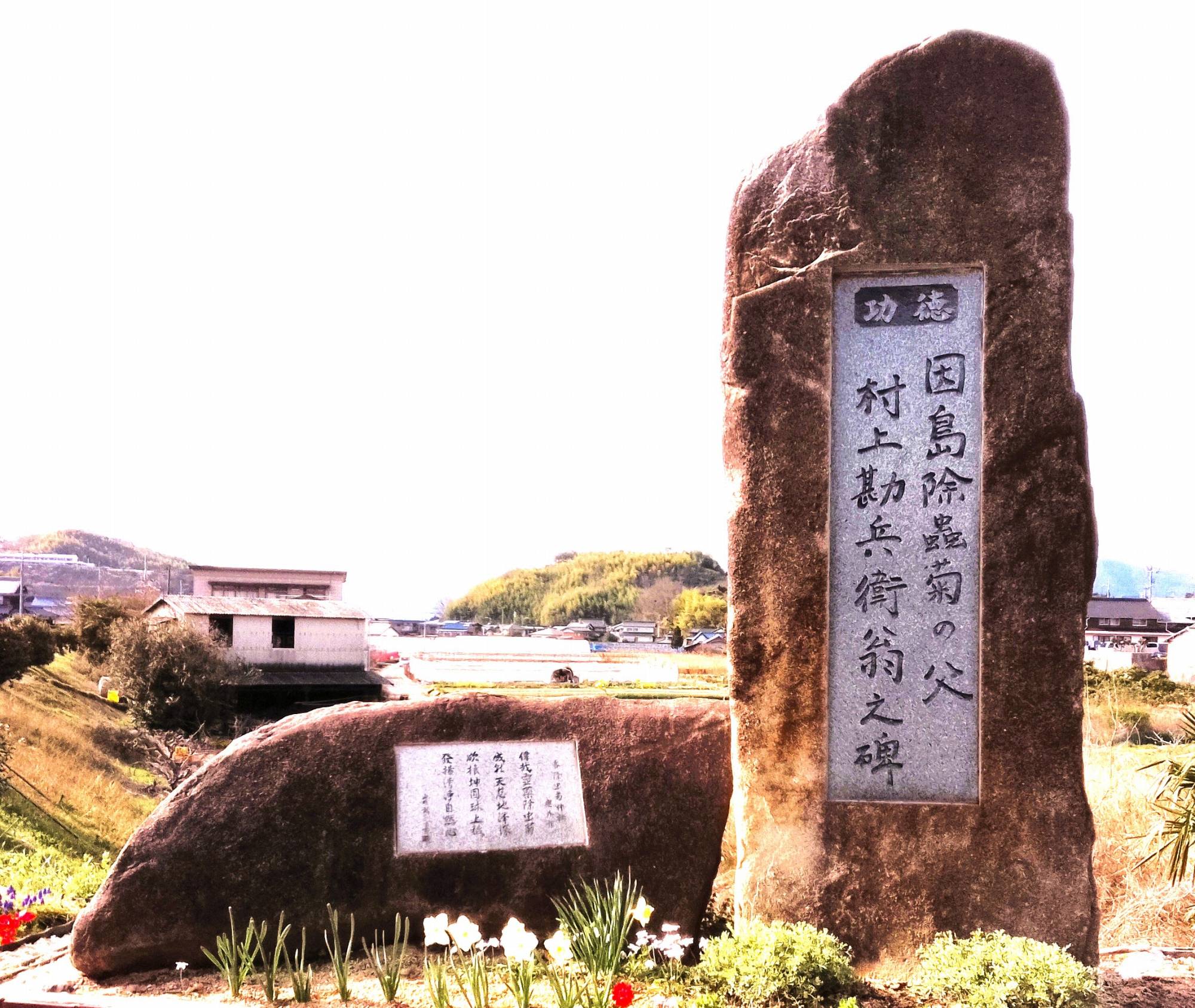 前回紹介した重井町一本松の重井村四国の碑の反対側に「因島除虫菊の父村上勘兵衛翁之碑」がある。