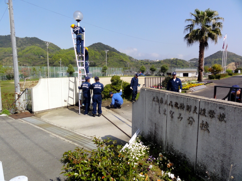 先任伍長の井手孝宏さんを先頭に、輸送艦「くにさき」乗員23人による、尾道特別支援学校しまなみ分校でのペンキ塗りが14日、行われた。